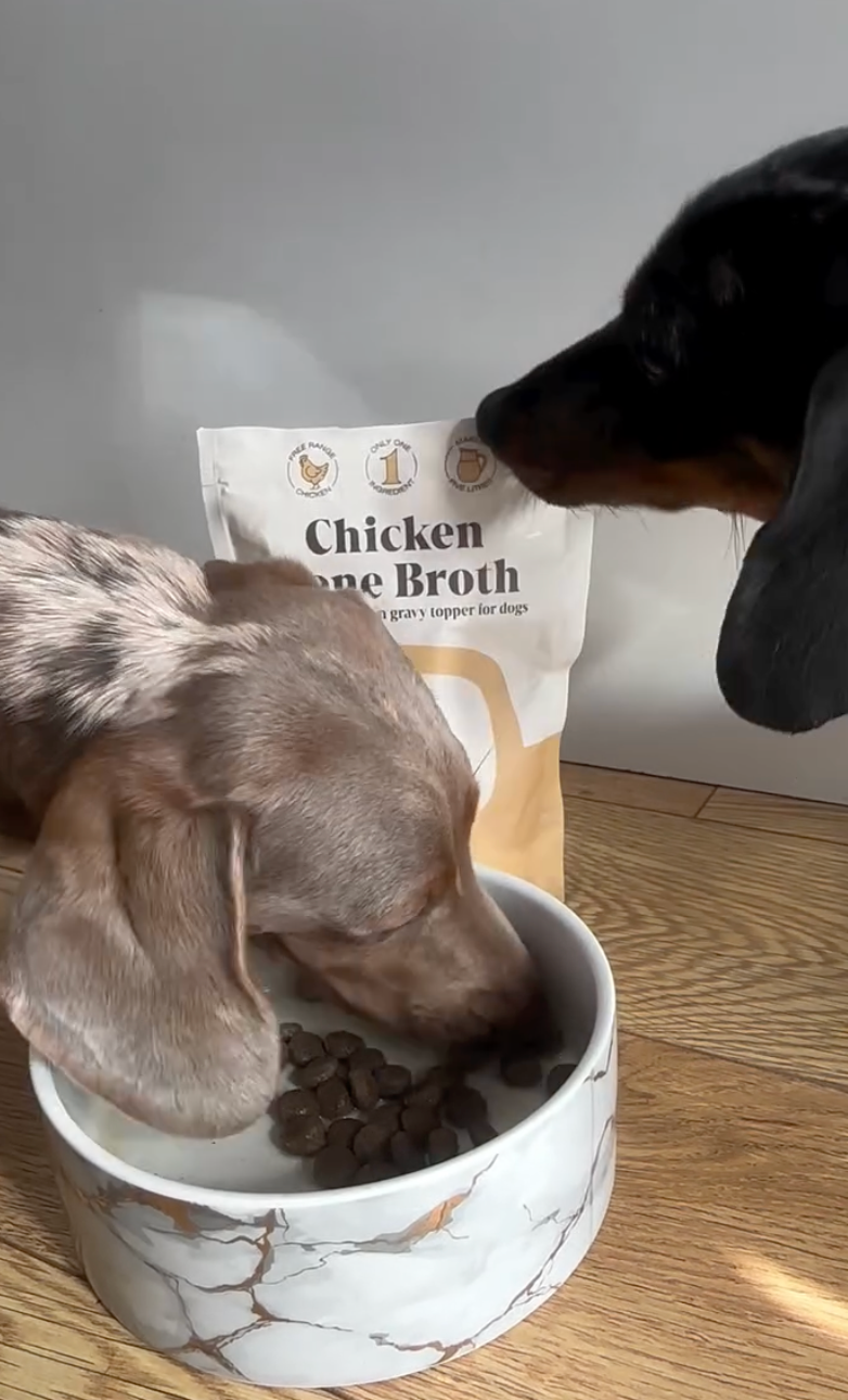 I either mix it with water to make a gravy or sprinkle it as is (when I don’t have time), and they lap up their dinner in no time. The smell isn’t bad either!